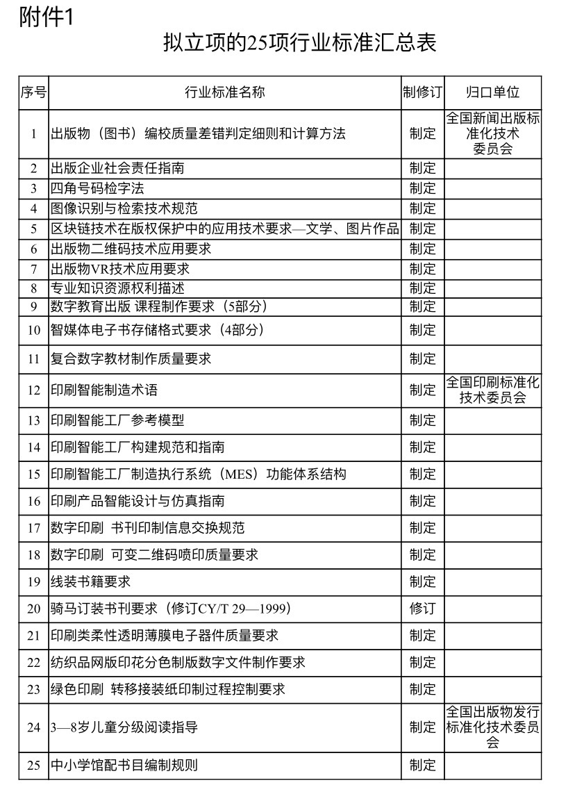 5月15日,國(guó)家新聞出版署官網(wǎng)發(fā)布《關(guān)于新聞出版業(yè)2020年第一批擬立項(xiàng)行業(yè)標(biāo)準(zhǔn)項(xiàng)目的公示》,25項(xiàng)行業(yè)標(biāo)準(zhǔn)擬立項(xiàng)。通知由中宣部出版局發(fā)布。公示截至日期為2020年6月15日。